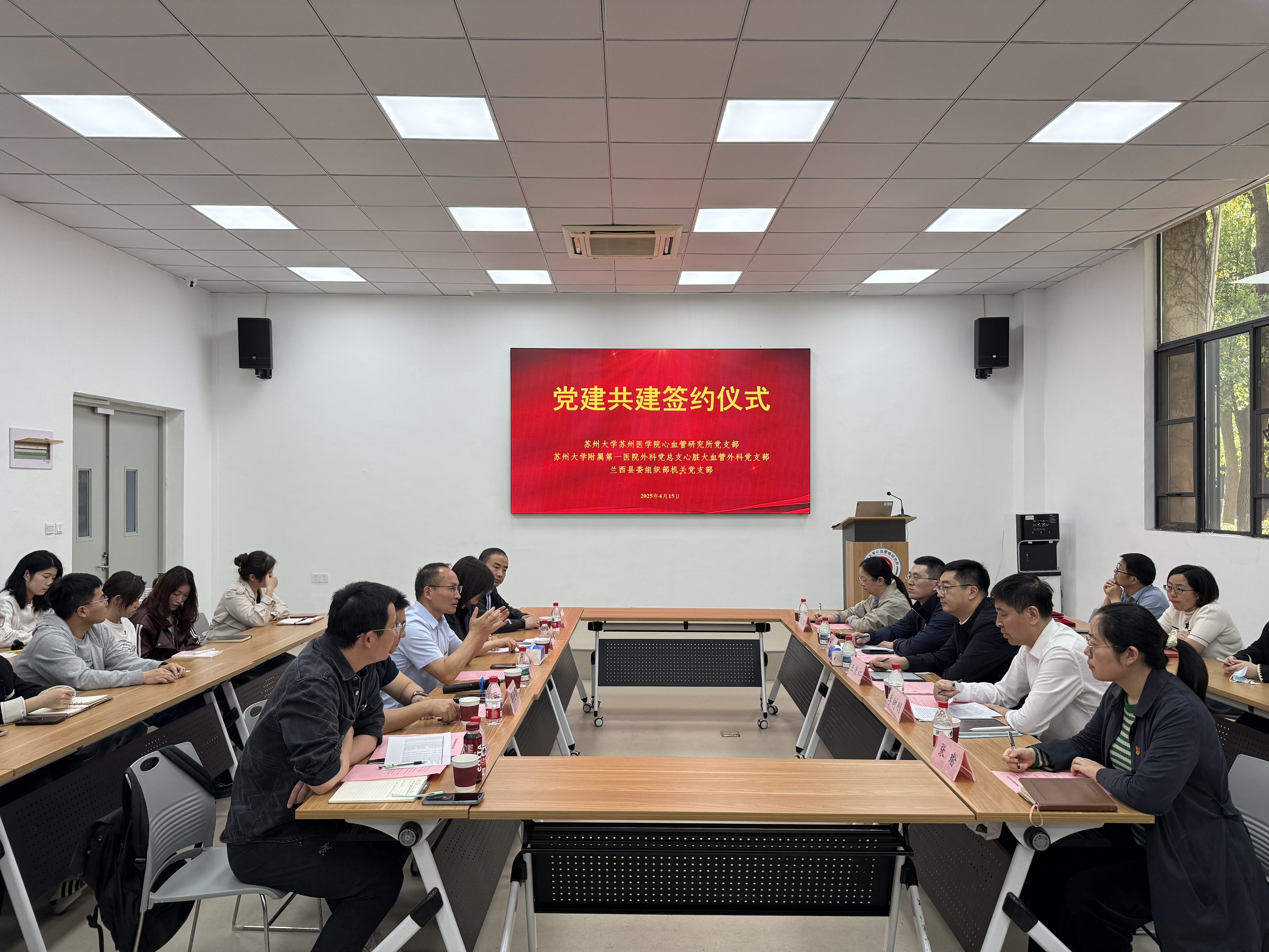 为落实教育部“双带头人”教师党支部书记“强国行”专项行动部署,推动基层党组织优势互补、资源共享,促进党建与业务深度融合,4月15日下午,苏州大学苏州医学院心血管研究所党支部、附属第一医院心脏大血管外科党支部与兰西县委组织部机关党支部在苏州大学北校区开展党建共建、科技赋能、医疗合作等议题的交流活动,共绘校地融合发展新蓝图。兰西县委常委、组织部部长王秉仁,县卫健局局长李树刚,县组织部副部长郑兴业,苏州医学院党工委副书记吴德建,心血管研究所党支部书记胡士军,附属第一医院心脏大血管外科党支部书记黄浩岳等出席。会议由苏州大学心血管病研究所副所长卢玮主持。