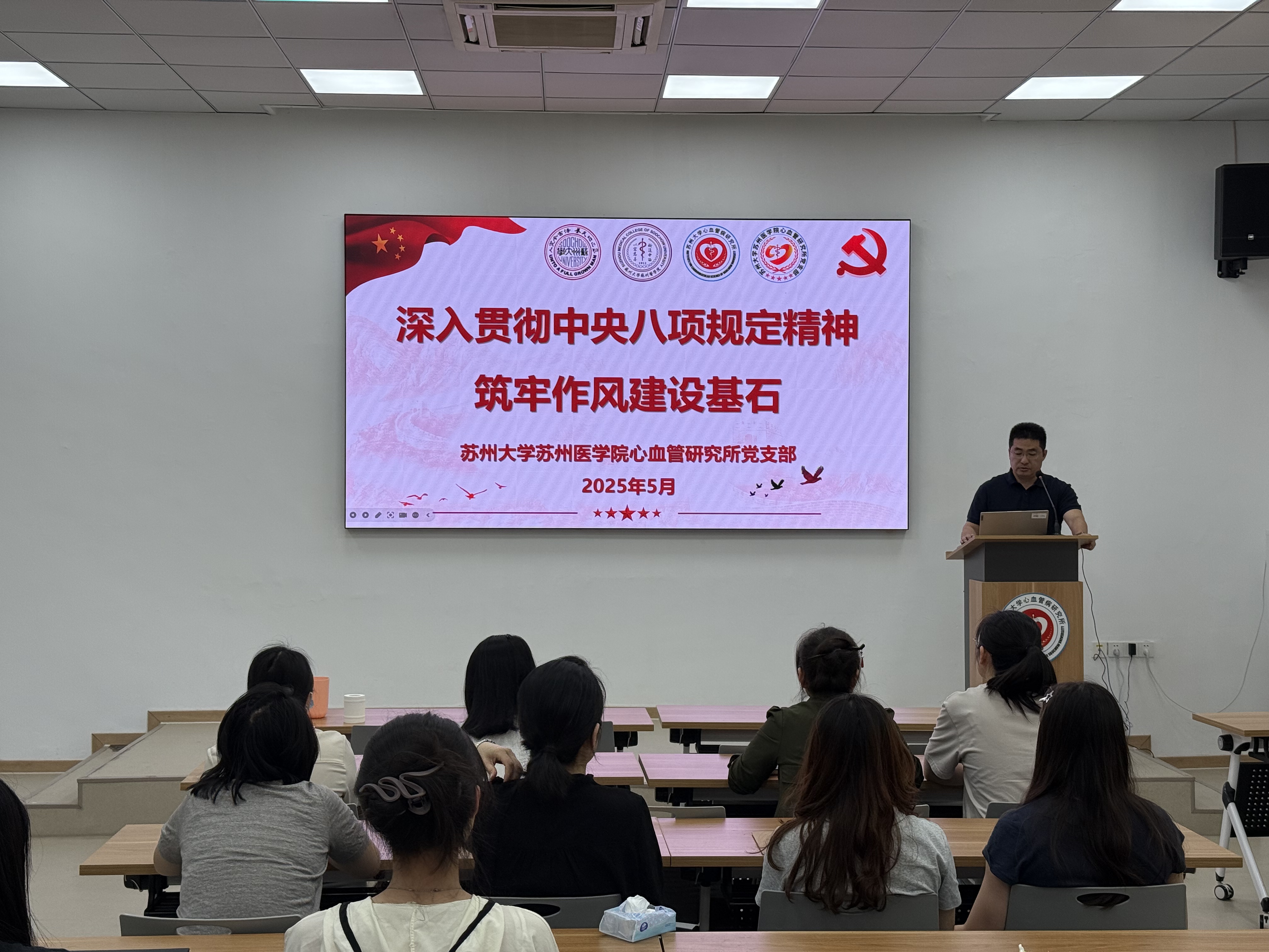 为持续深化作风建设,强化党员干部纪律意识,2025年5月14日,苏州大学心血管研究所党支部在北校区机物楼1楼会议室召开“深入贯彻中央八项规定精神,筑牢作风建设基石”专题学习会。会议由党支部书记胡士军主持,全体师生党员参加,围绕中央八项规定的核心要义、实践要求及新时代作风建设路径展开深入研讨。
