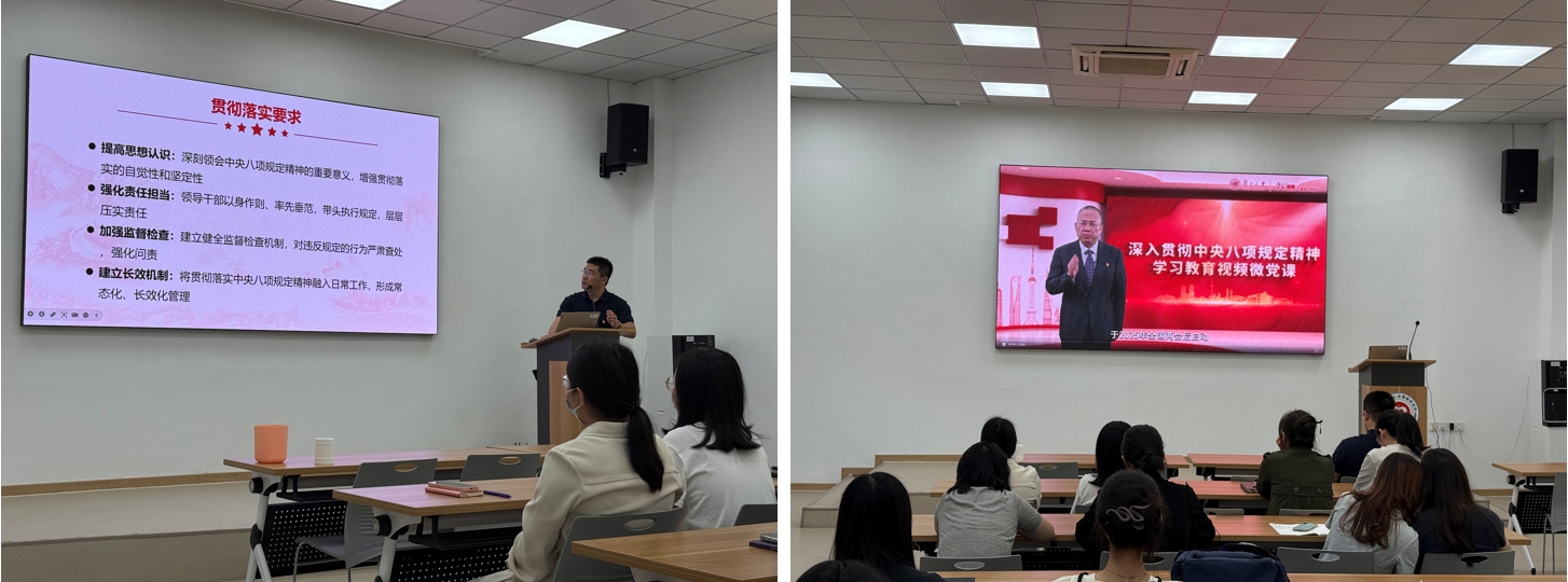 会议通过视频短片与数据图表,展示了中央八项规定实施十余年来的显著成效。这些数据背后,是党心与民心的高度契合。针对下一步工作,会议提出了“三个结合”的落实要求:首先,要与科研诚信建设相结合。建立“学术道德承诺书”制度,将八项规定纳入研究生新生入学教育、教师年度考核,严禁“学术浮夸”“成果注水”等不良风气;二是与师德师风建设相结合。开展“廉洁导师”评选,规范师生交往边界,杜绝“科研经费私用”“学术资源垄断”等行为,营造平等互信的导学关系;三是与服务师生需求相结合。设立支部作风建设意见箱,每月召开师生座谈会,重点解决实验设备共享、科研成果转化等问题,让作风建设成果惠及广大师生。