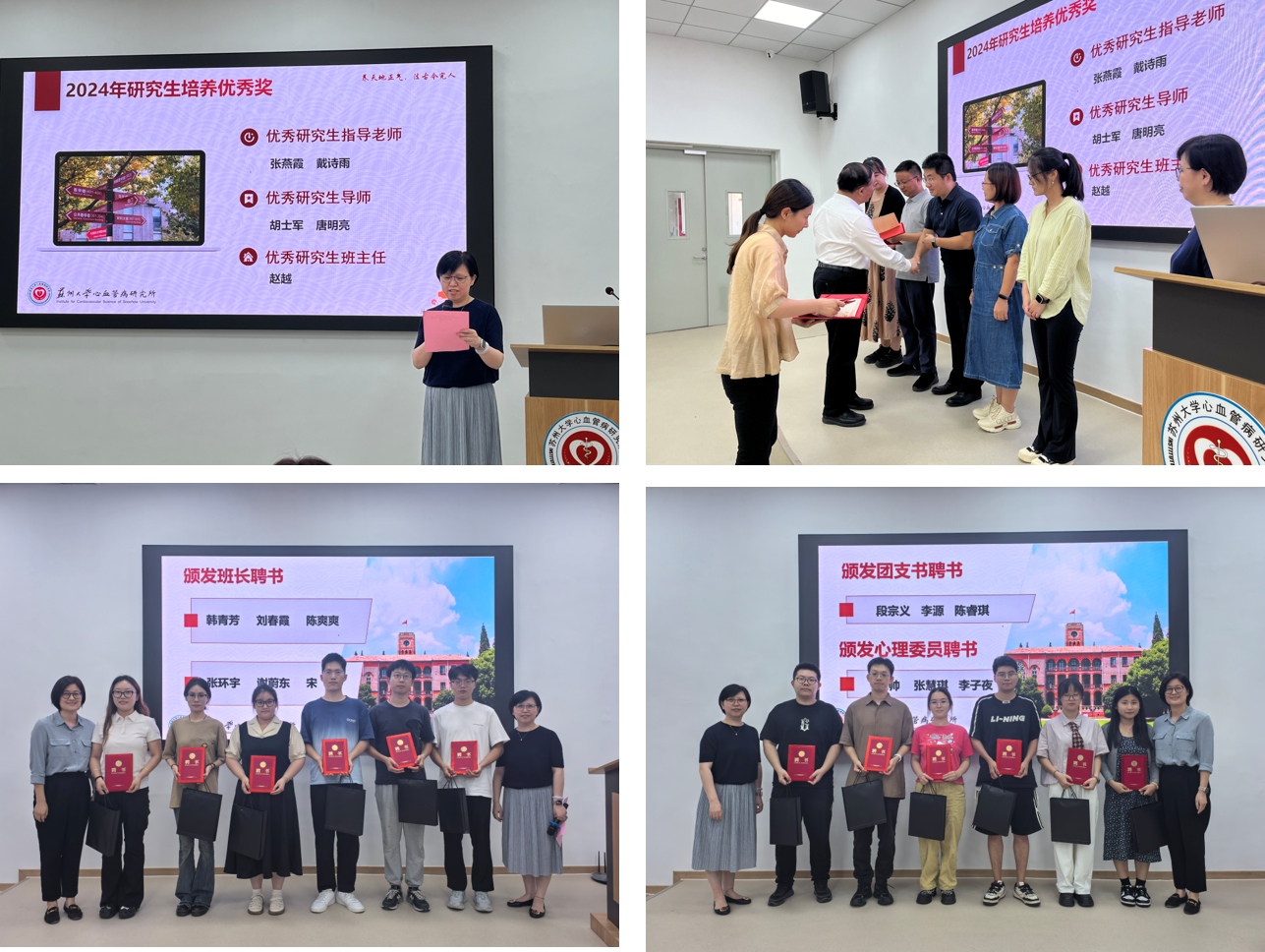 副所长胡雁秋宣读了研究所2024年研究生培养优秀奖及2024-2025学年班干部聘任名单。所长沈振亚、副所长胡雁秋和卢玮分别为他们颁发了获奖证书和聘书。