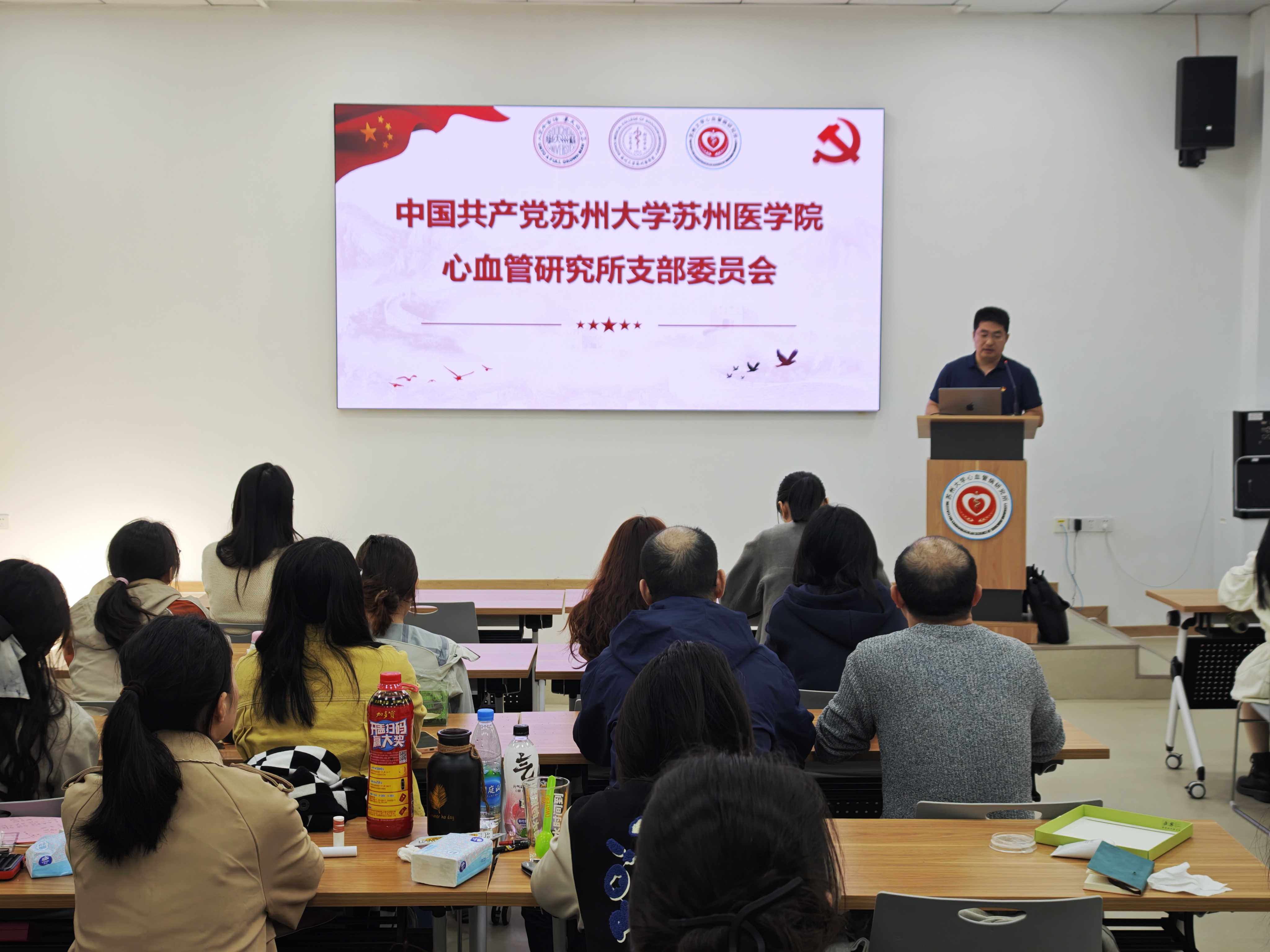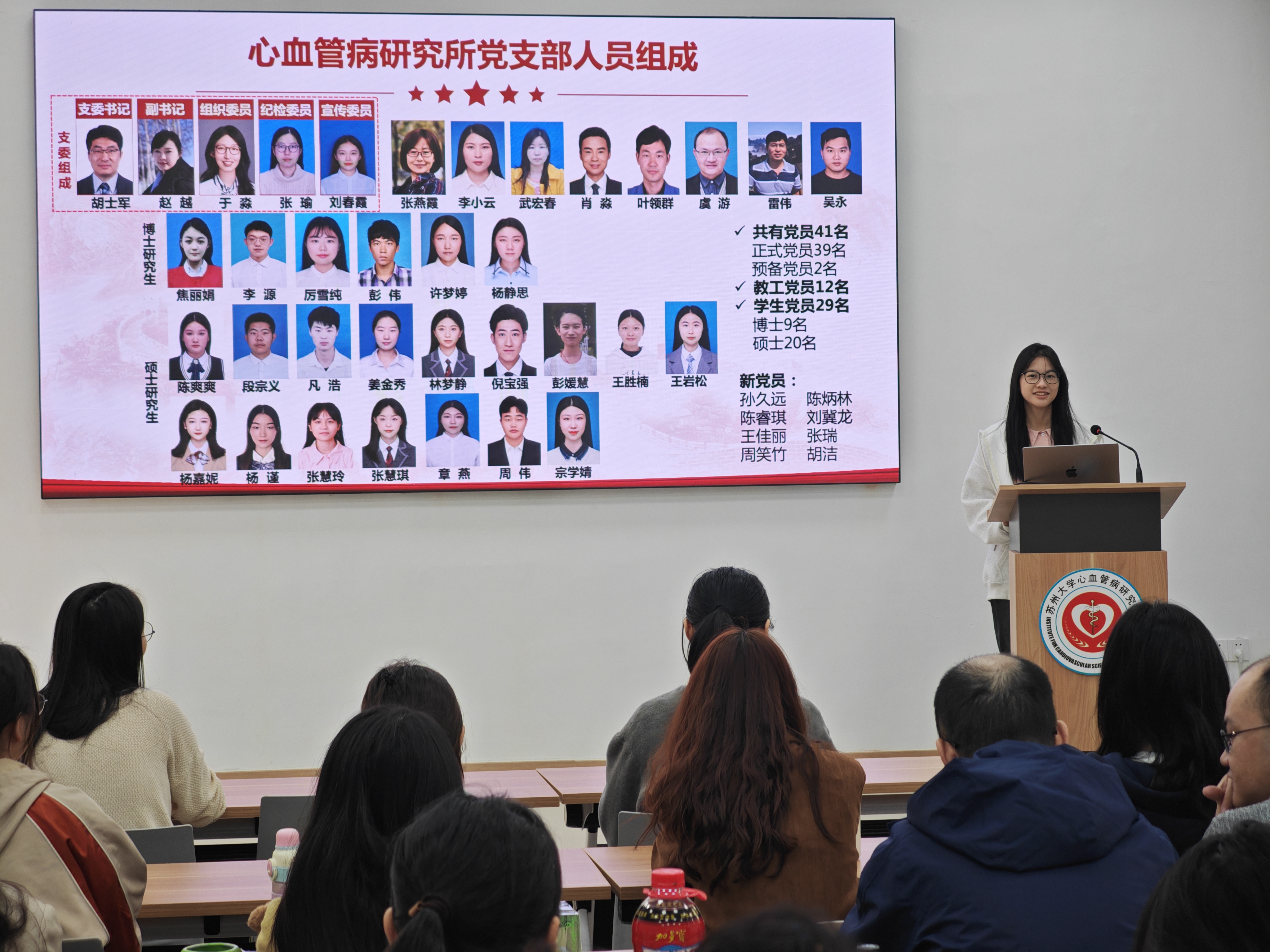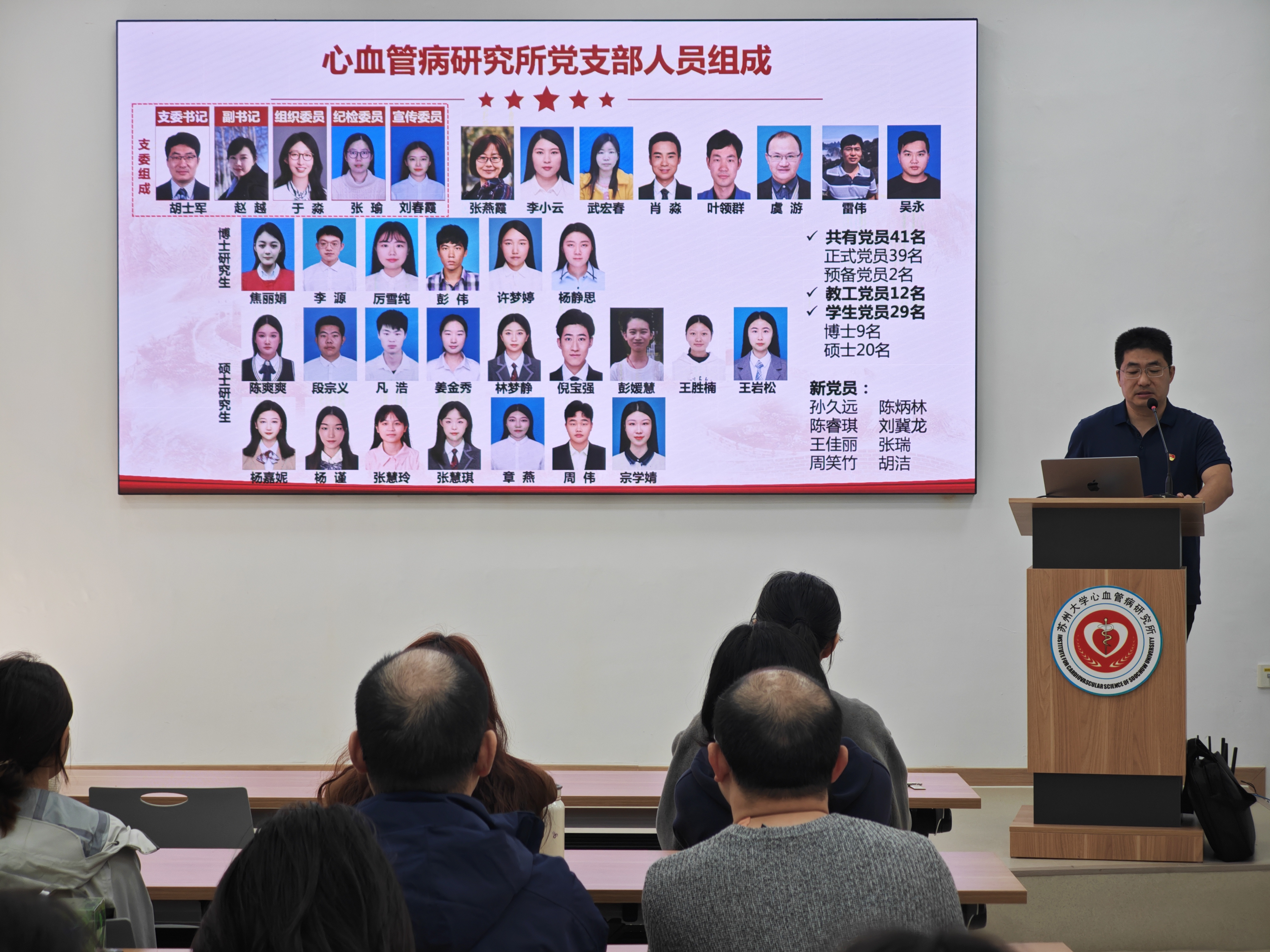 为进一步推动心血管病研究所党建工作的发展,苏州大学苏州医学院心血管研究所党支部于2024年10月25日上午,在机物楼1楼会议室召开了支部委员会。此次会议的议题是欢迎孙久远、陈炳林、陈睿琪、刘翼龙、王佳丽、张瑞、周笑竹、胡洁八名新党员同志,鼓励大家积极推荐身边的优秀老师和同学加入中国共产党,推动研究所的党建发展。本次大会由党支部书记胡士军老师主持,支部全体党员出席本次会议。